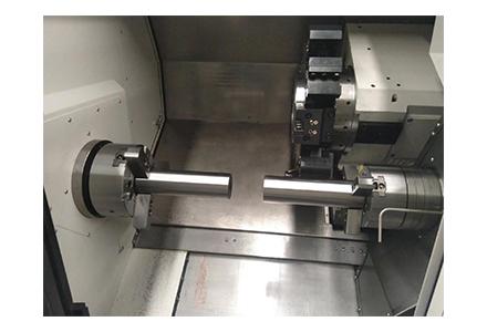 2)主軸箱及副主軸箱采用電主軸結(jié)構(gòu),主軸轉(zhuǎn)速高,剛性好,動態(tài)響應(yīng)快,提高了加工圓度和表面的精度。對列式雙電主軸結(jié)構(gòu)可在高速旋轉(zhuǎn)的情況下進行工件交換,配合12工位伺服刀架,可實現(xiàn)對工件的全部或大部分工序的加工,很大程度上節(jié)省了裝夾和加工時間,提高了加工效率。雙C軸功能可在任一主軸上進行工件分度和曲面插補加工。